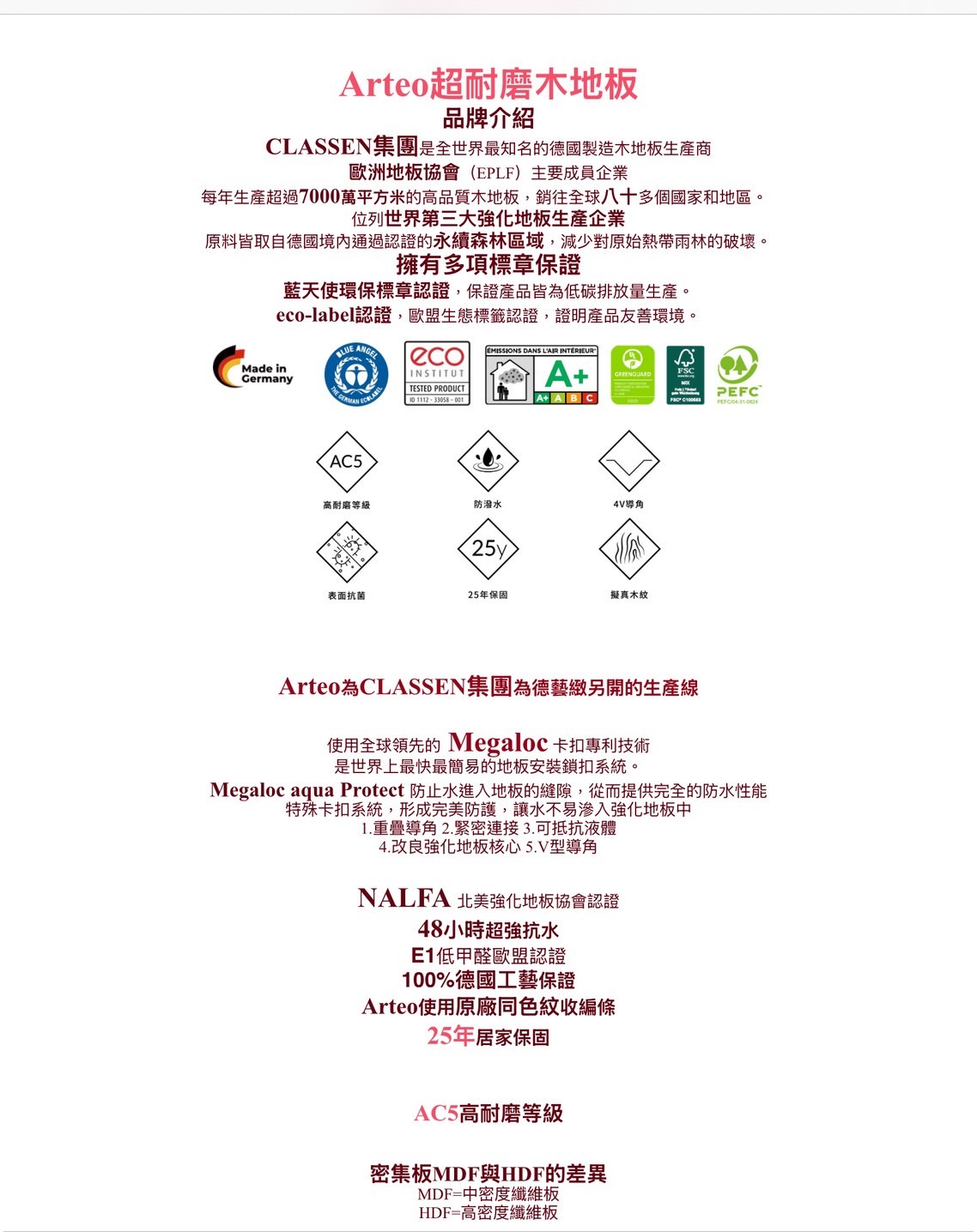 其表層具備防刮耐磨塗層,不易因生活使用造成刮痕,並通過嚴格的環保檢測,達到 E1 等級的低甲醛標準,讓家中空氣更健康。地板擁有良好的防潮與穩定性,不易因濕度變化而翹曲或膨脹,適合台灣高濕度氣候。使用德國卡扣技術可快速施工,不需動用釘膠,未來維修也更加方便。